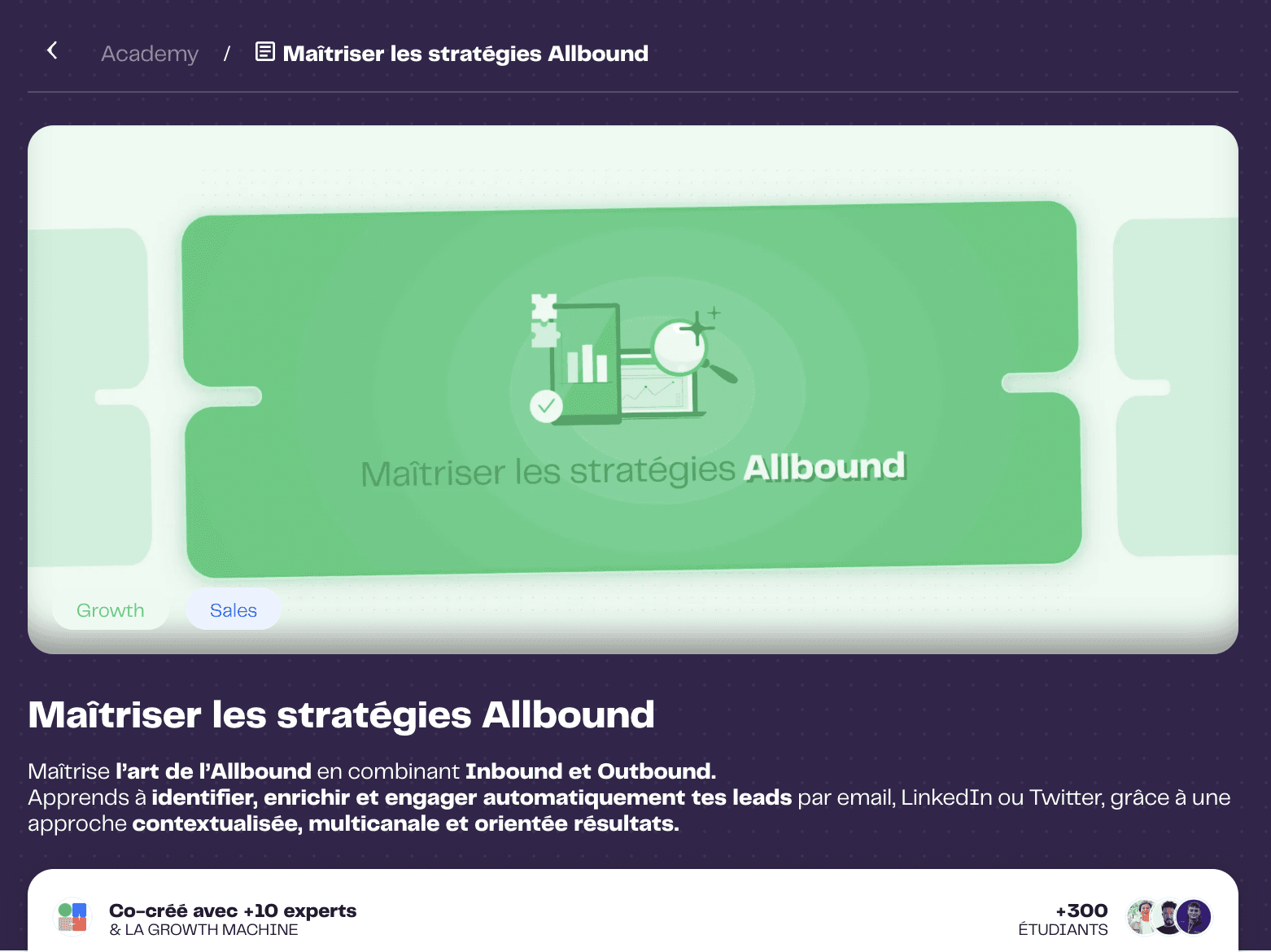 Réutiliser le contenu existant pour créer un nouveau contenu pédagogique unique : l’académie Allbound à destination des Sales. Une académie entière en moins de 2 mois, sans recourir à des ressources externes (pas besoin d’experts supplémentaires).